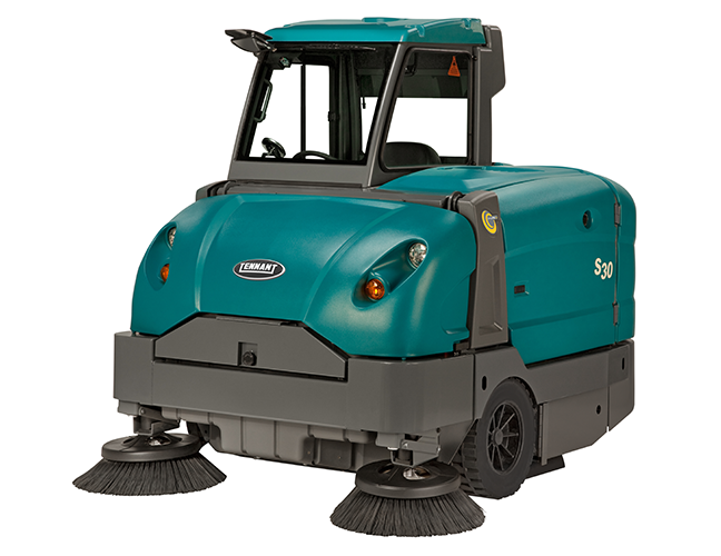La barredora mediana de operador sentado S30 de Tennant recoge fácilmente todos los elementos, desde polvo de cemento hasta desechos pesados.